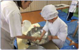 毎年5歳児クラスは栄養士と一緒に「手作りおやつ体験」をします。白玉だんごやカップケーキ等、一つ一つの工程を友だちと一緒に行うことでより食に興味を持っています。